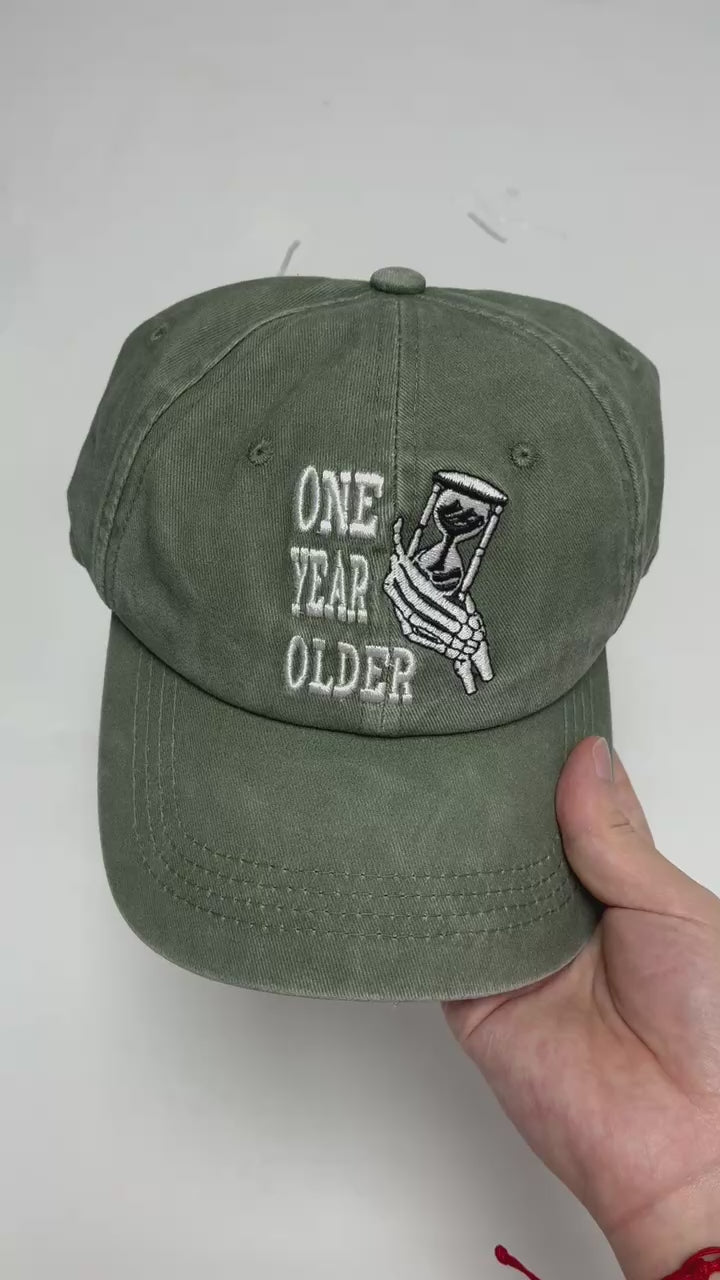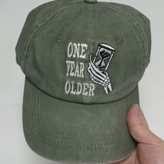 - Timeless Design: Classic dad hat silhouette with a low-profile fit, featuring the signature One Year Older hourglass logo for a touch of meaningful style.